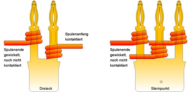 Bei Motoren kann der Draht unterbrechungsfrei zum nächsten Pol weitergeführt werden. So sind nur 3 Anschlüsse erforderlich.